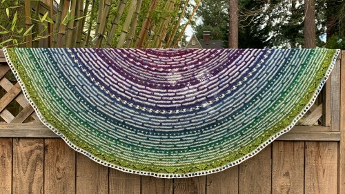 Adding this many rows put me just past where I’d need another increase row based on the pi shawl formula, so I was counting on the flexibility of knitting to make it work because I didn’t want an increase so close to the edge. Also, no more yarn! I used a Russian bind off for the refinished edge, because I knew it was going to be quite a stretch blocking the edge out.