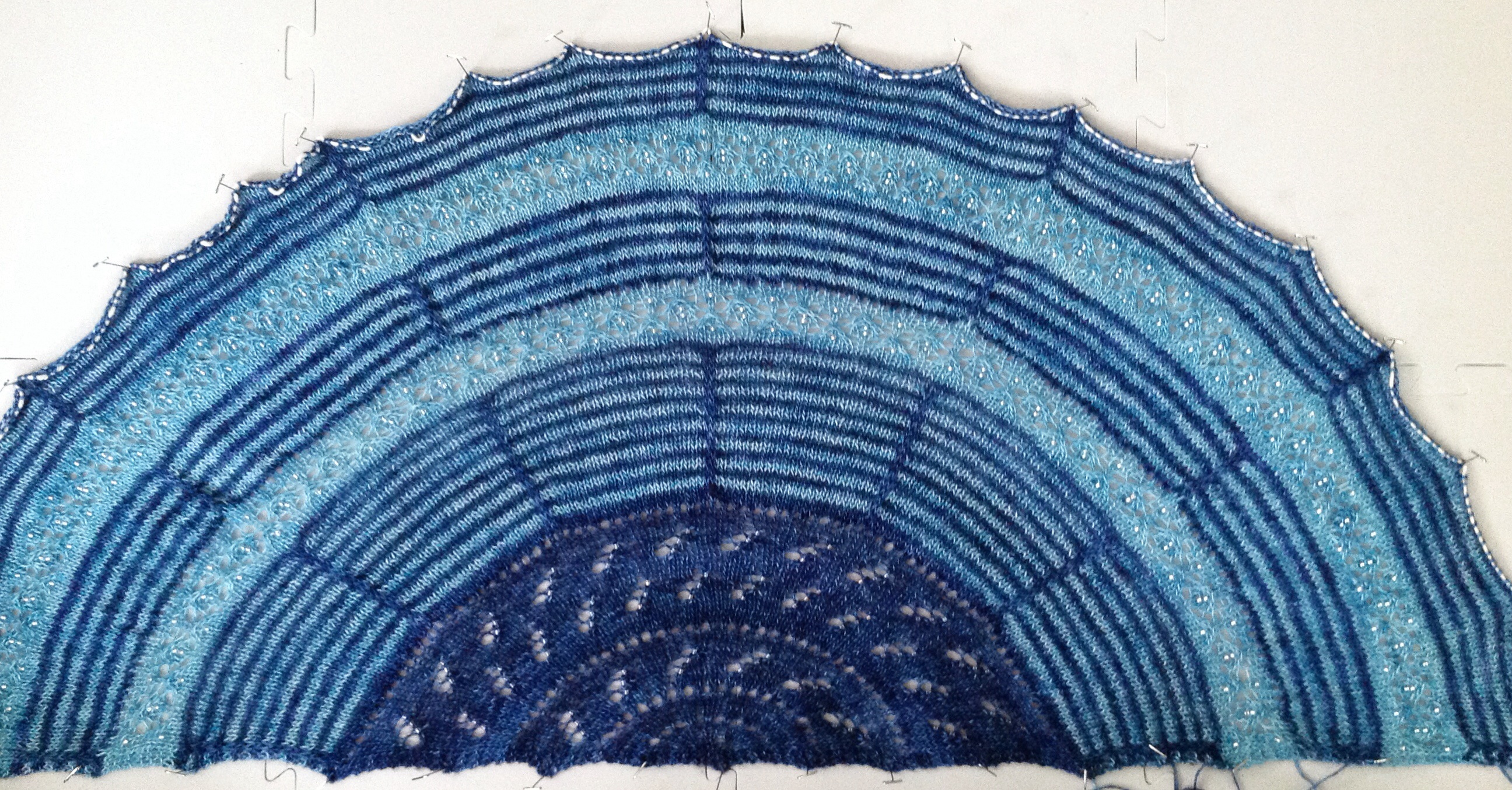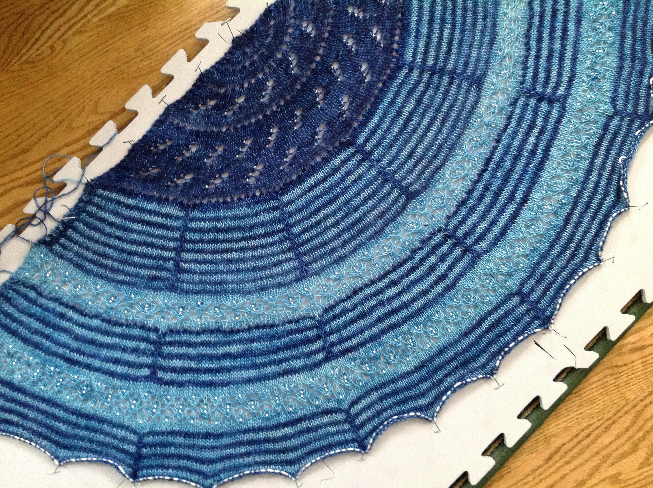 I added an extra band of roses halfway through the second stripe sequence. They’ll stand out better when properly blocked; I only pinned it out a bit.