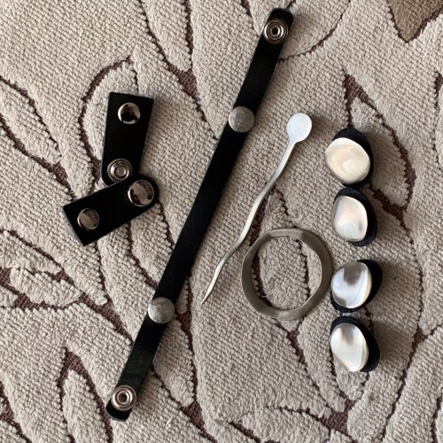 You can make the shape into a shawl pin with the stick pin, or a shawl cuff with the leather band. You can use the stick pin by itself. The other two leather pieces are to close a cardigan front. And the buttons have a round ball at the end of the shank, and a leather back to pop over the ball. You can move your buttons from one piece of knitwear to the next. So far I’ve only used the cuff, but I’ve used it a lot.