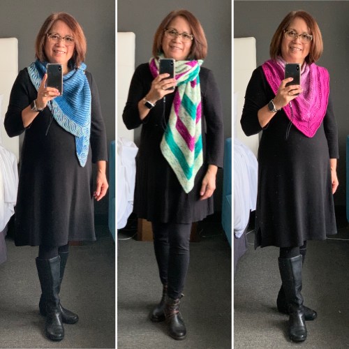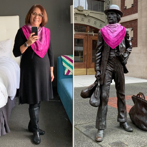 I didn’t have a full length mirror in NYC, but I did in Tacoma, so I could do my traditional what did I wear collage. Coffee Breakers Shawl (from Brioche Knit Love), Camellia Wrap, Ebb and Flow cowl.