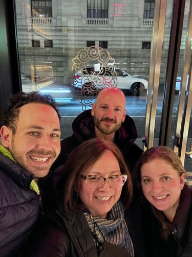 So happy to meet up with Keith Leonard and Shaina Bilow again after Knit Maine. And new friend Dario Tubiana, too. (Check out the sheep on the door of La Pecora Bianca.)