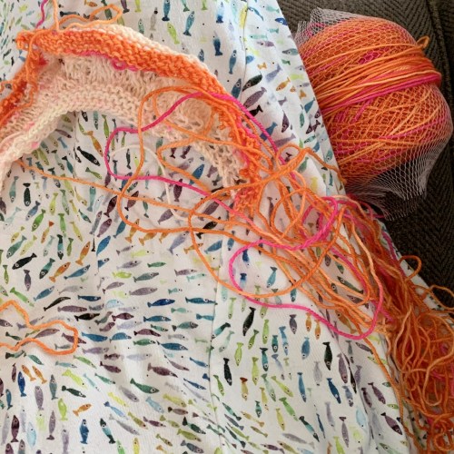Getting the yarn to cooperate for assigned pooling is tricky when you don’t have many stitches on the needles yet. I ripped it out and started again after cutting off about 18” of yarn at the beginning of the orange. Much better. The orange and hot pink are pretty fun together. We’ll see if it fulfills my vision for this piece. Wish me luck!