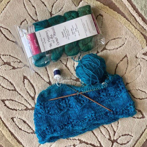 The linen knit is coming along nicely, but I decided I needed an even simpler project for multi-tasking. I cast one one more Ebb and Flow cowl, which is mostly stockinette. I bought these minis from Schmutzerella Yarns at Red Alder Fiber Arts Festival for just this purpose. So it’s not stash!