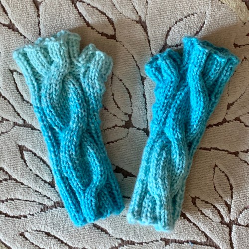 The mitts and hat each take about 100g/130 yards of bulky weight yarn. They’re designed here with Knit Picks Chroma Twist Bulky, shown in the Narwhal colorway.
