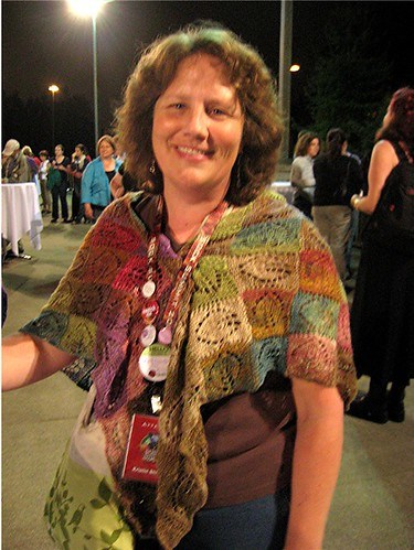 One of the really fun things about knitting events is meeting bloggers from far away that you “know” but have never met in person. I briefly met Jessica, with whom I’ve been chatting about our respective Tokyo adventures this summer. Carrie was working at the market information booth. I met Heather at the Knitted Wit booth. And I met Cristi in the market, too. She’s just as fun in person as she is online. Cristi was wearing her Charlotte’s Web shawl, and it is even more gorgeous in person.