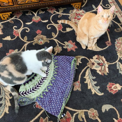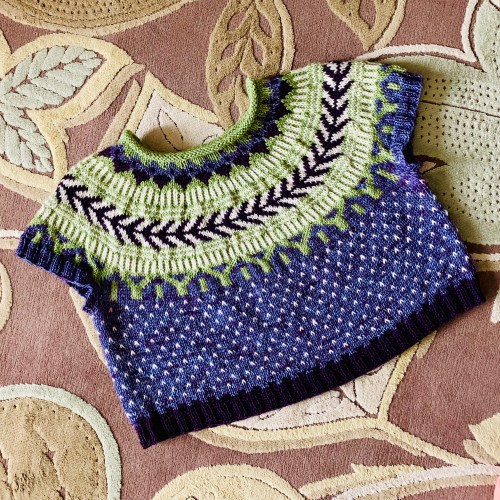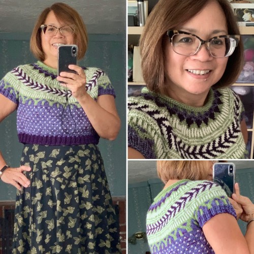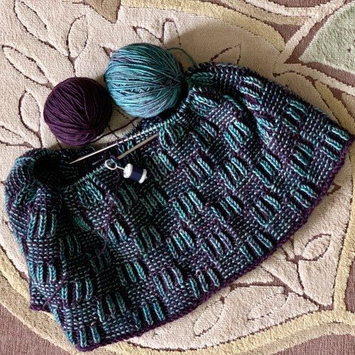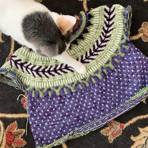 Anyway, I had planned to work the body in just the Iris (light purple) color, but when I started knitting it that way, it was boring. And the fabric was so much lighter in weight than the color work yoke. So I’ve decided to put in the white flecks for interest. But not the dark purple ones, because they barely show up, so it’s not worth that effort. This all means I’ll have more plain Iris stockinette rounds, which is great for multitasking/reading while I knit.