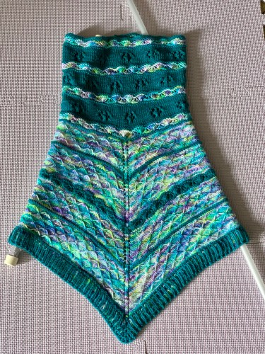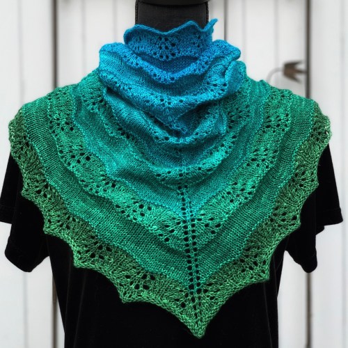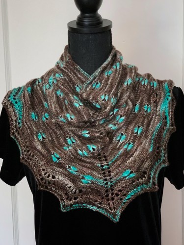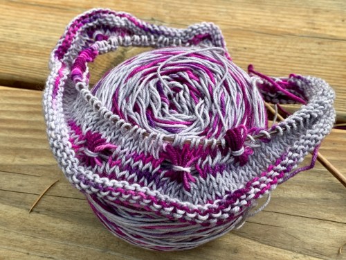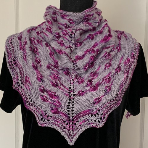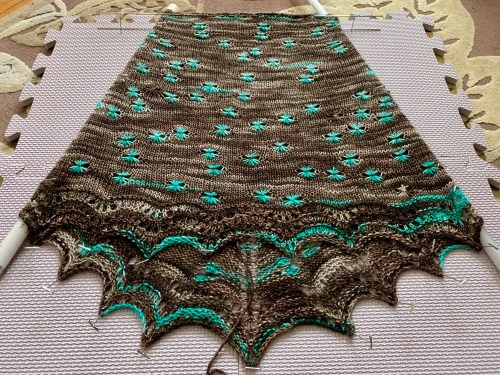 Still on the assigned pooling bandwagon! I just blocked this, and I love it. It’s a fingering weight bandana cowl with a cascade of assigned pooling stars, and an Old Shale lace edging. This is one of my favorite looks to wear; it looks like a shawl but it stays on without a fuss.