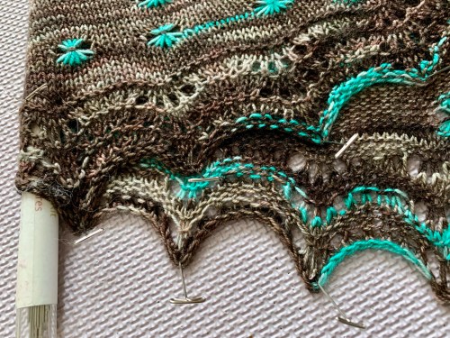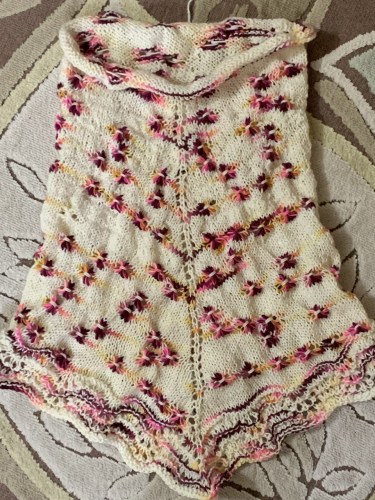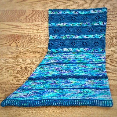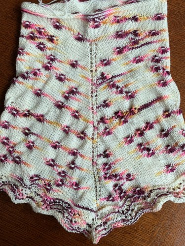 The stars are bigger and there’s less color leakage at the sides of the stars. And the fabric feels right, too. Winner! I also added one more 4 row repeat of the old shale lace at the bottom edge, because there was enough yarn left to do that. I would have added that to the end of the Wine Mom version too, if I had thought of it. It all depends on how much yarn you have left.