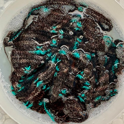 Soak cowl in cool water with a bit of no-rinse wool wash for 20 minutes. Gently squeeze out excess water (do not wring). Roll up cowl in a folded towel and walk on it (!) to remove more water.