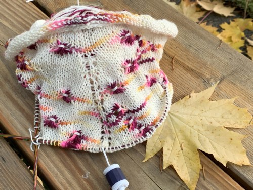 I just finished writing the pattern and video tutorial, and it will be tech edited this week. I’m looking for a few test knitters; you’d need one skein of fingering weight yarn that’s dyed for assigned pooling, with a color pop of about 8” long. I used Dream in Color Smooshy with Cashmere.