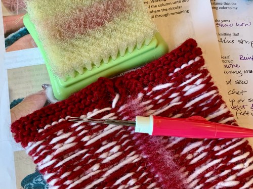 I finished my worsted weight frog hat, too. Free pattern from me, for worsted and super bulky weight yarns! This yarn was burlier than most worsted, so it’s a little bit big on me.
