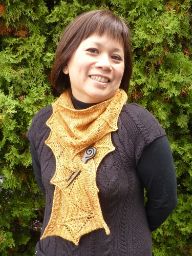 If you have about 400 yards of yarn, your deeper shawl will probably be most comfortable worn centered on your back. The ends don’t provide a lot of overlap for wearing this like a scarf. Rachel’s shawl took 390 yards at 6 st/inch.