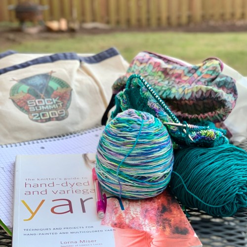 The book on the table is Lorna Miser’s The Hand Knitter’s Guide to Hand-Dyed and Variegated Yarn. It talks about different dye methods, and how to make the most of them. A lot of the book is about how to recognize if colors will pool, and how to avoid pooling, if desired. There are lots of stitch patterns to play with. I’ve swatched the one that it will be perfect for this project. We shall see.