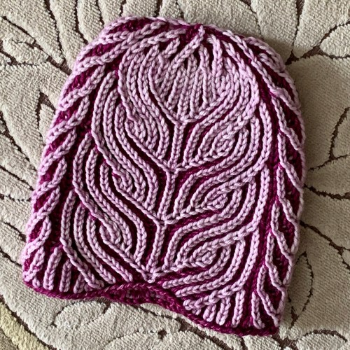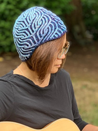 I designed this hat as a teaching piece for my classes. You’ll learn both left and right leaning brioche double decreases on the first patterning round; it’s like jumping in the deep end of the pool! After that it’s oodles of brioche rib before the next increases and decreases.