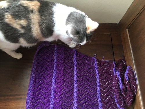 I also blocked my Fern Shawlette that I knit for my previous KAL. Finally! You’ll note that I’m artfully hiding the ends I have yet to sew in.