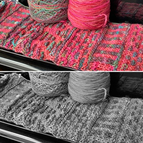 I thought that the deep purple would be perfect, that it would make the Liquidambar pop, but a few rows in I could see that it would all be too dark. I then tried the light pink, but it was so strikingly pale that it wanted to upstage the Liquidambar.
