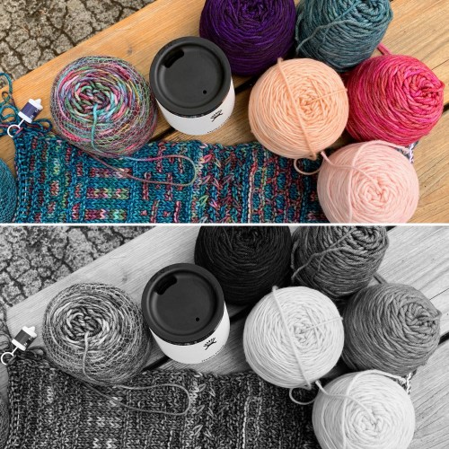 I can see the contrast better, both color and tonal. You can see it in the vertical stripe section in the grayscale photo. The garter/stockinette contrast helps move things along, too.