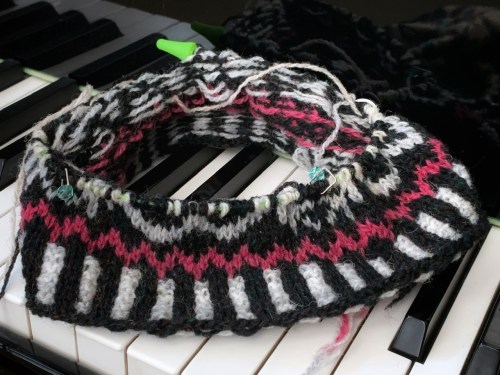I tried to take a picture of just the knitting, but my camera keeps reading the pink incorrectly, so you’ll just have to trust me on this one for now. It’s very fun knitting, but I have to set it aside to work on my Buggiflooer Cowl before Sunday’s class.