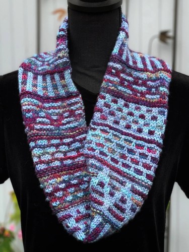 Remember I was looking for a couple social knitting projects to take with me? I didn’t knit much on my Slip Away Cowl sample; too much counting. But I worked on it in my stateroom at night, and a bit when I got back home.