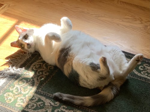 Bisquee hopes you’re keeping cool! We have central air conditioning, so she’s not as hot as she looks. She’s enjoying her bit of sunshine.