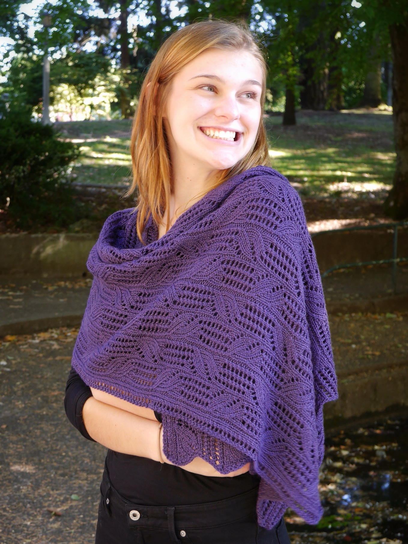 I had 550 yards, so this knit up into a gorgeous large wrap. The pattern is easily adapted to your yardage; it starts at the narrow point and grows from there.