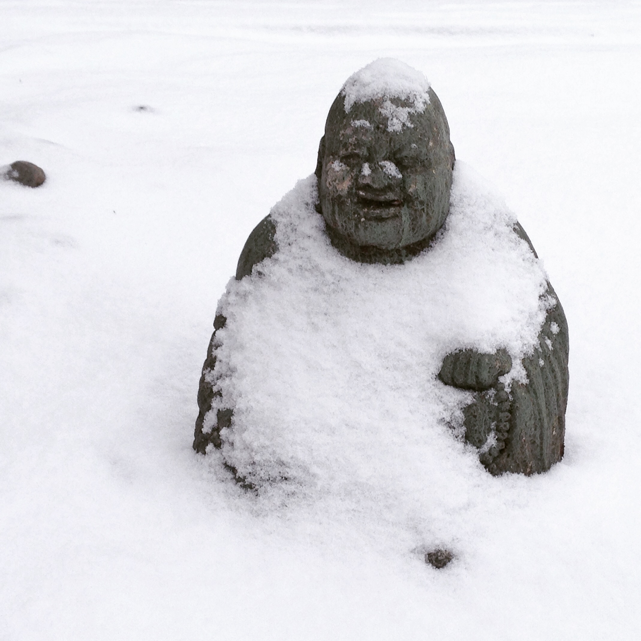 Two days later we had snow, and then freezing rain on top of it. I saw this Buddha in a neighbor’s yard.
