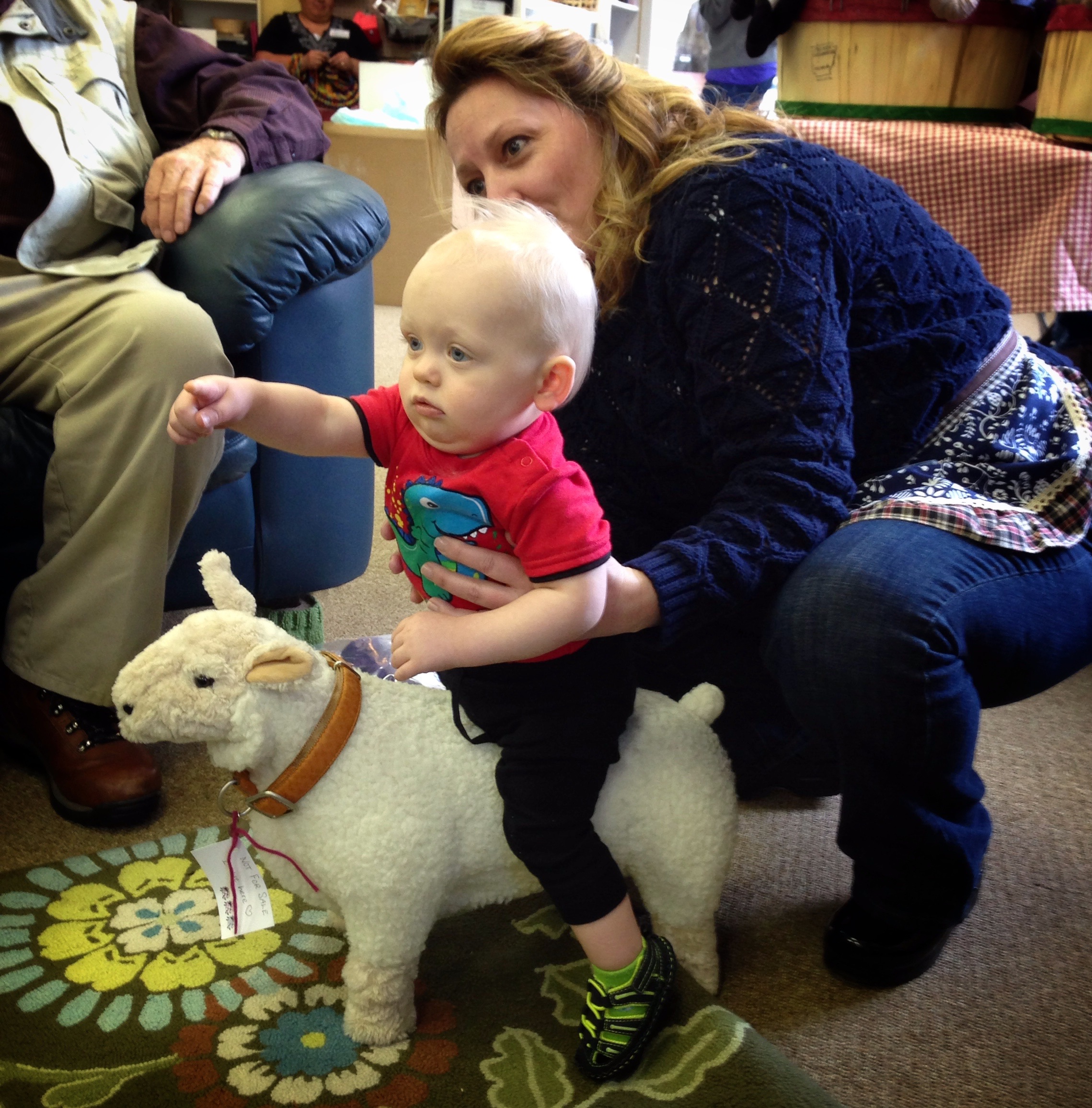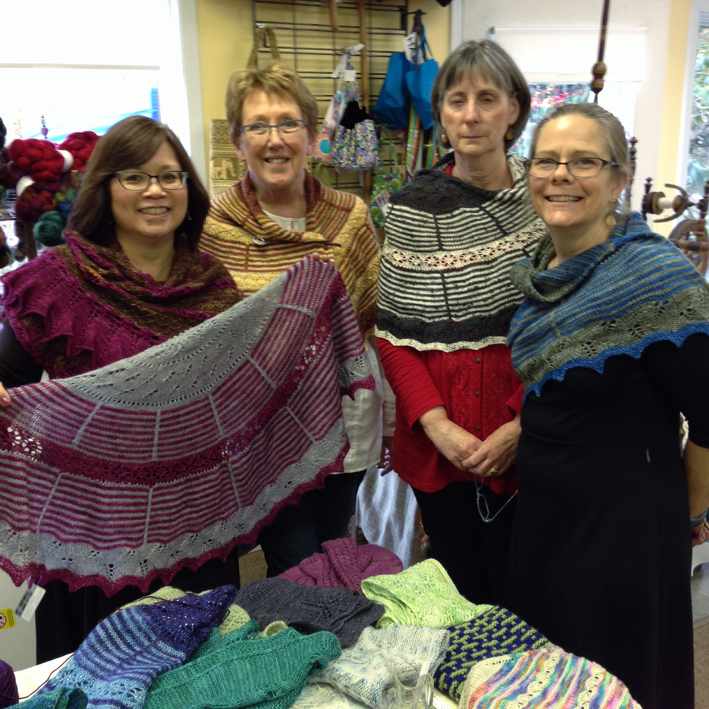 I started the Crawl on Thursday with a trunk show at Wool ‘n’ Wares. The lovely ladies there wore their Rosaria Shawlettes (my design for last year’s MKAL) to welcome me. Sweet!