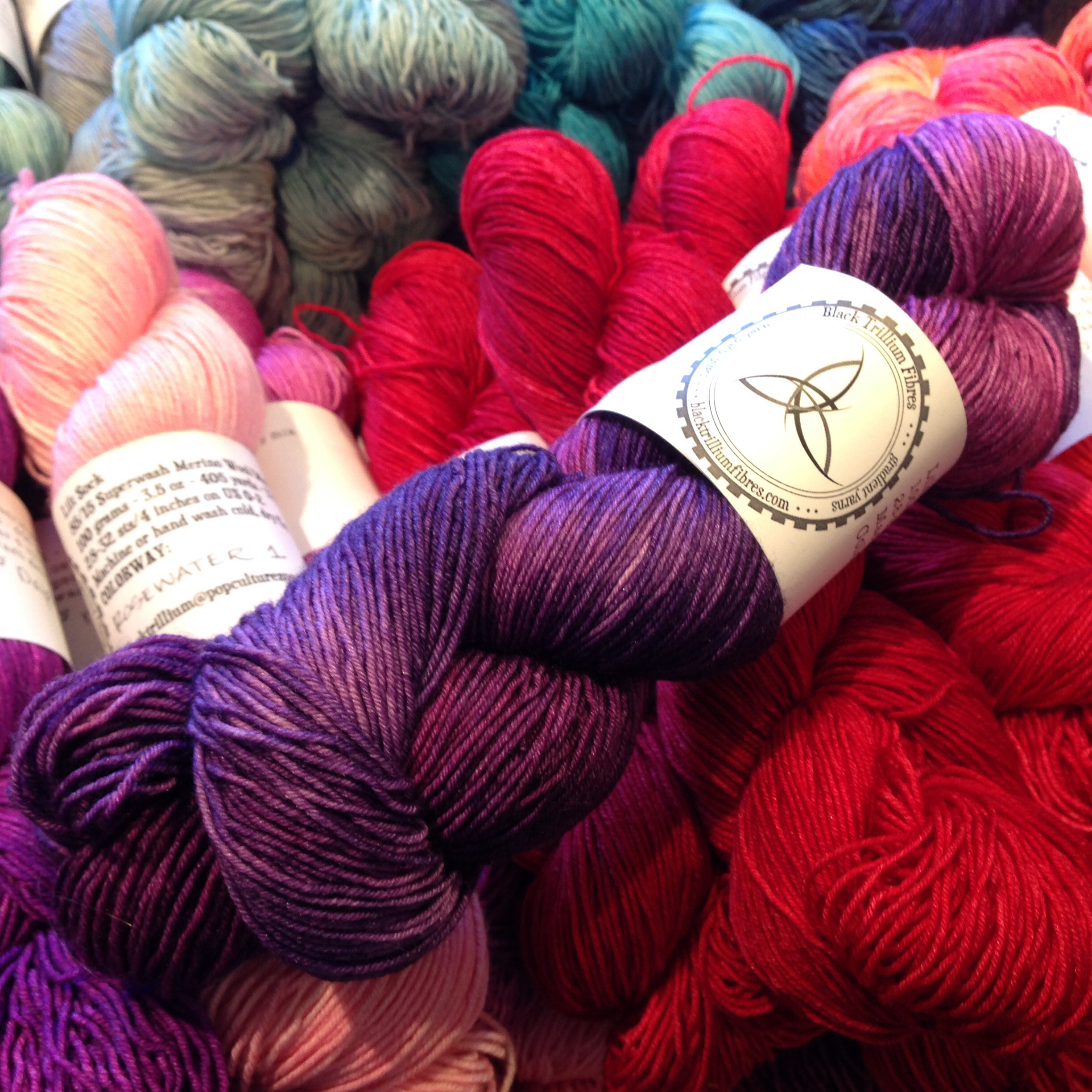 On Saturday, Cathy and I went to Knitting Bee, where I chatted with Melanie of Black Trillium Fibres and made arrangements to get some of her DK weight Sublime yarn in her Tyrian colorway.