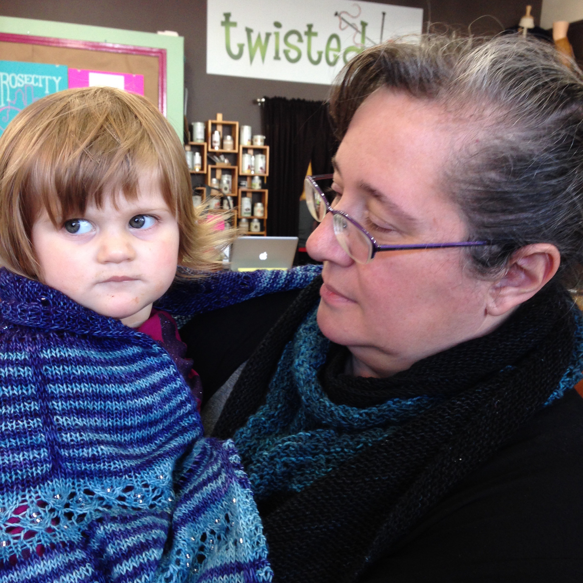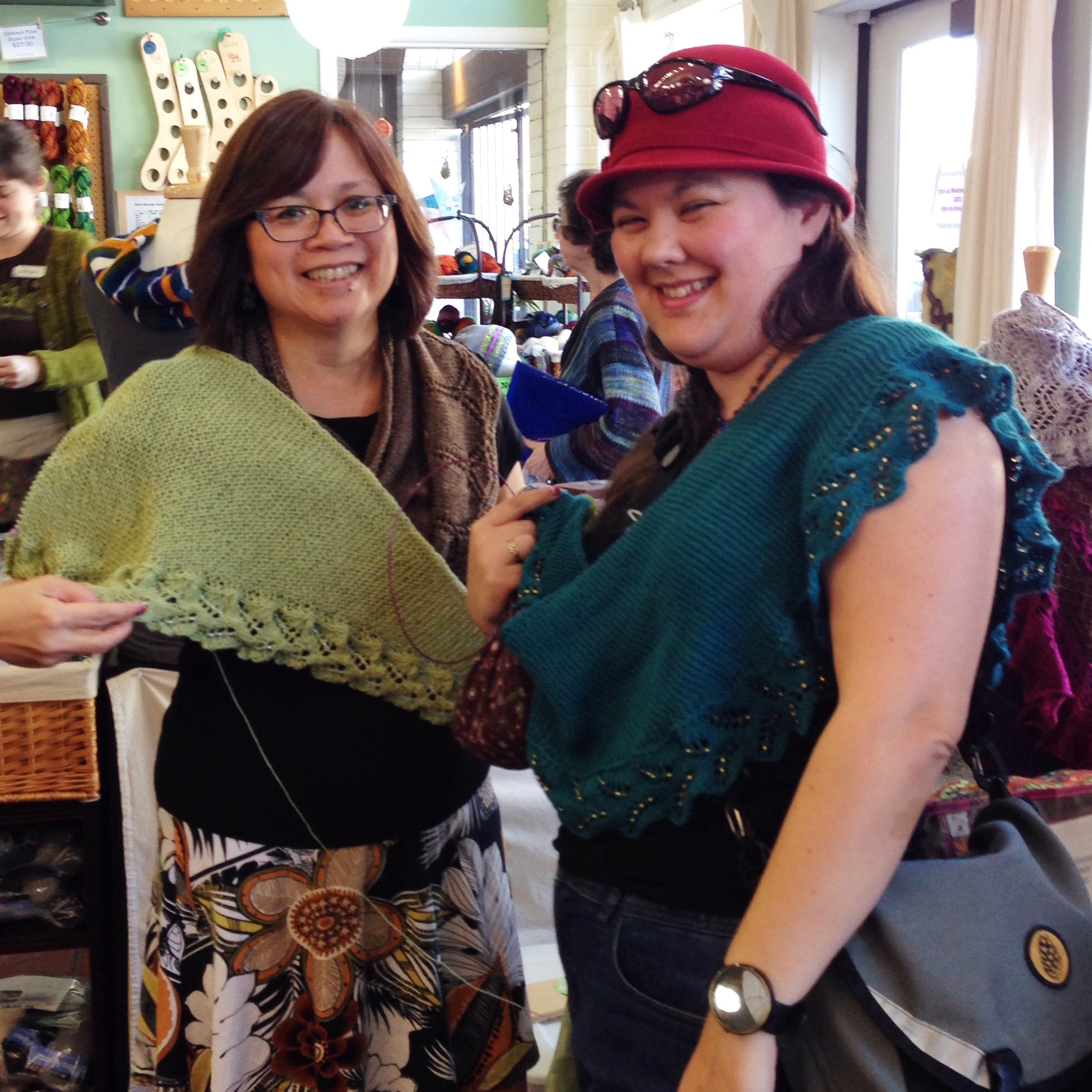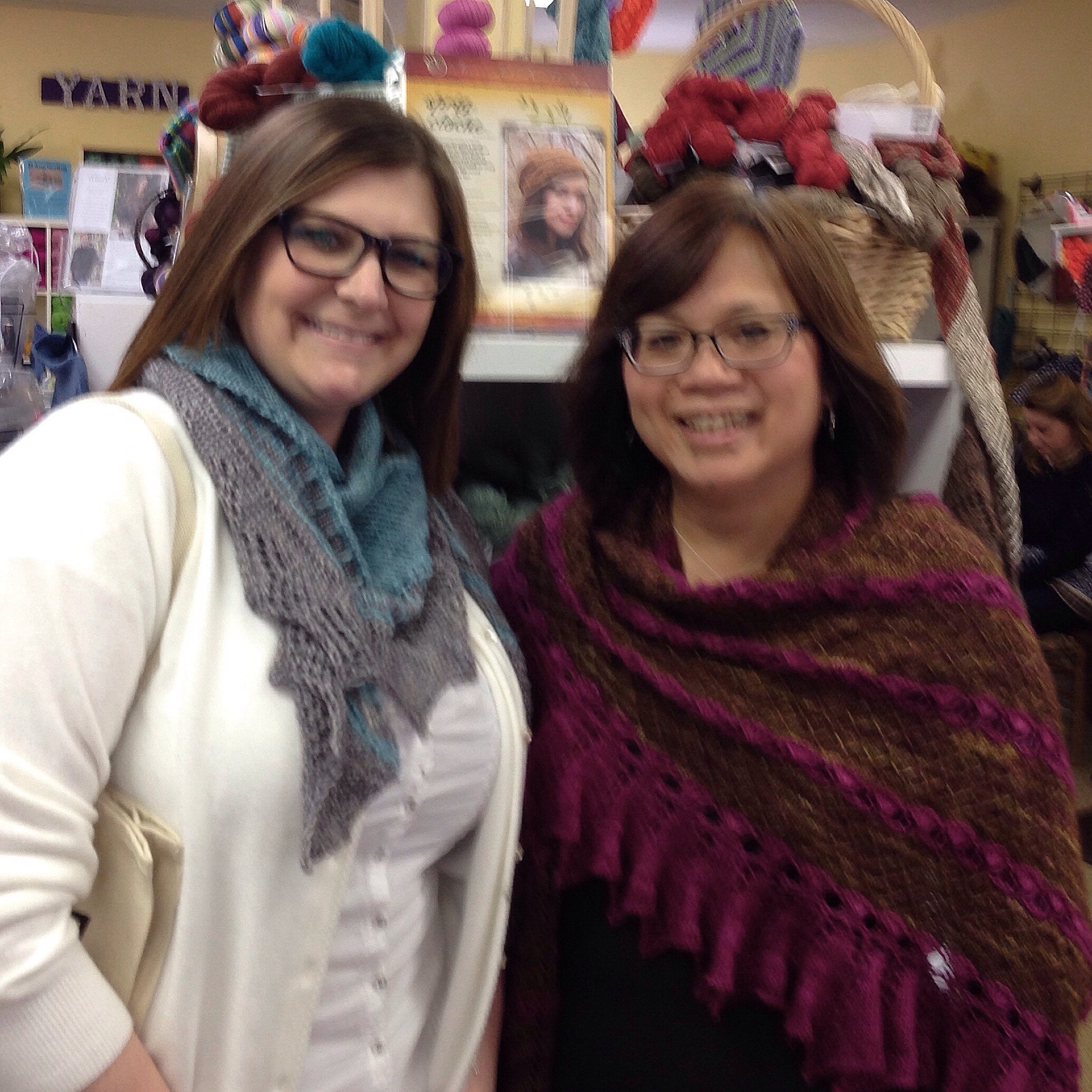 On Sunday I finished up the crawl with a trunk show at Twisted. Terri came by with her finished Fern Shawlette from the XOXOKAL. Mine isn’t quite done, but we both modeled them.