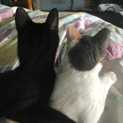Biscuit is occasionally hissing at him, but mostly getting along. This picture is from introduction day, which was Day 3 in our house. Much calmer than the introduction to Gator (son’s cat who was visiting for 2 months). Maybe she thinks Tyler is going to come take this one away, too?