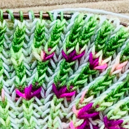 I hooked up the column with a crochet hook: The loose pink loop was the first to get picked up on my hook. Then I hooked up the running thread *between* those two loose stitch columns. That takes up the slack that made those two stitch columns become loose when the in-between stitch dropped down, so it’s firming up the green stockinette area, as well as rescuing my loose loop.