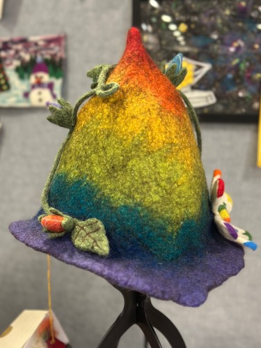 This wet felted hat with needle felted ornamentation was my favorite piece in the exhibition. It’s by Val Kinman, who was in my log cabin class on Sunday.